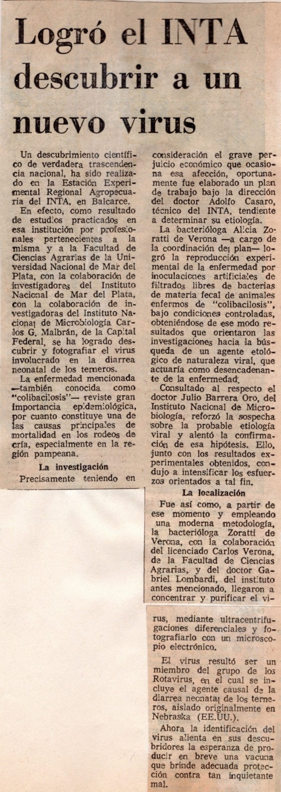 En efecto, como resultado de estudios practicados en esa institución por profesionales pertenecientes a la misma y a la Facultad de Ciencias Agrarias de la Universidad Nacional de Mar del Plata, con la colaboración de investigadores del Instituto Nacional de Mar del Plata, con la colaboración de investigadoras del Instituto Nacional de Microbiología Carlos G. Malbrán, de la Capital Federal, se ha logrado descubrir y fotografiar el virus involucrado en la diarrea neonatal de los terneros.