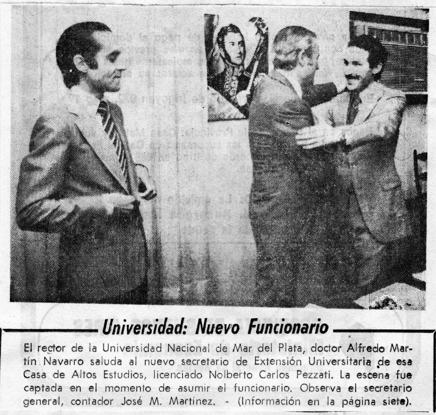 El rector de la Universidad Nacional de Mar del Plata, doctor Alfredo Martín Navarro saluda al nuevo secretario de Extensión Universitaria de esa Casa de Altos Estudios, licenciado Nolberto Carlos Pezzati. La escena fue captada en el momento de asumir el funcionario. Observa el secretario general, contador José M. Martínez.