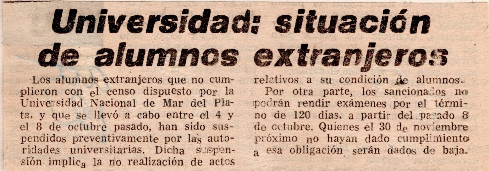 Los alumnos extranjeros que no cumplieron con el censo dispuesto por la Universidad Nacional de Mar del Plata, y que se llevó a cabo entre el 4 y el 8 de octubre pasado, han sido suspendidos preventivamente por las autoridades universitarias. Dicha suspensión implica la no realización de actos relativos a su condición de alumnos.